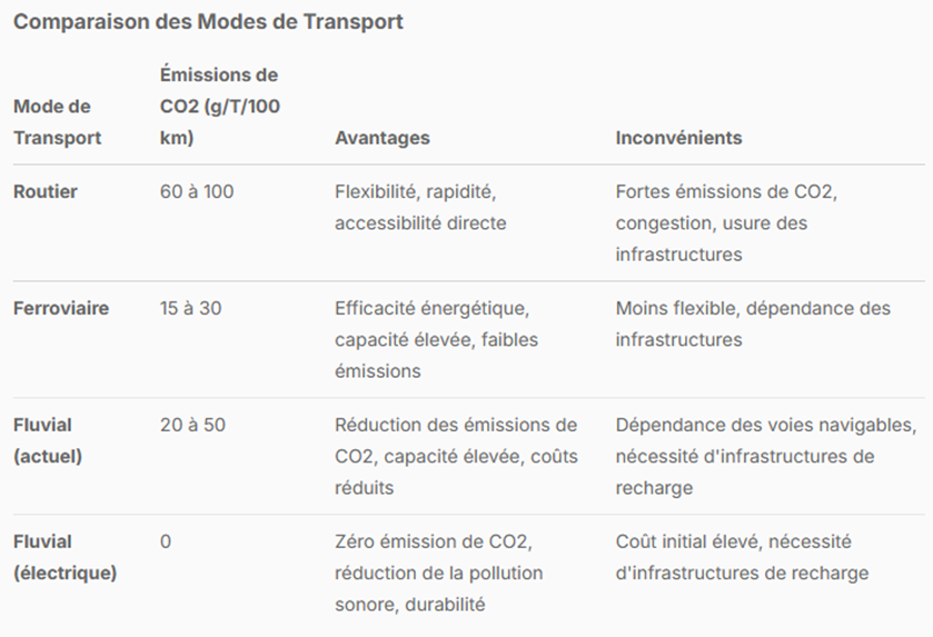 Le transport fluvial électrique représente aujourd’hui l’alternative la plus propre et la plus durable pour le fret. Avec zéro émission de CO₂, il surpasse largement les autres modes de transport en matière d’impact environnemental. En plus de réduire la pollution sonore, il offre une excellente capacité de chargement et des coûts d’exploitation compétitifs à long terme. Bien que son déploiement nécessite des investissements initiaux et des infrastructures de recharge, ses bénéfices écologiques et économiques en font une solution d’avenir incontournable pour une logistique responsable.
